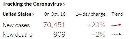 据《纽约时报》当地时间17日报道,当地时间16日,美国新增新冠肺炎确诊病例70451例,创7月24日以来新高,新增死亡病例909例。与此同时,16日当天,包括怀俄明州、明尼苏达州、威斯康星州等在内的至少九个州创下单日新增确诊病例数纪录。