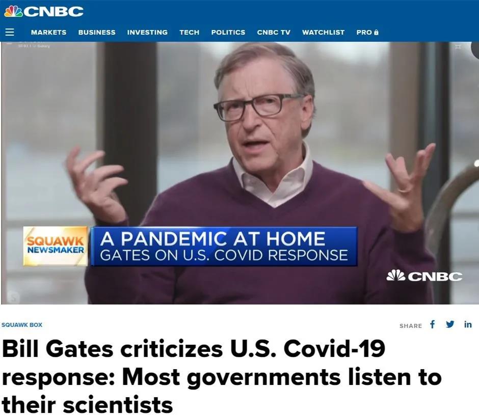 △比尔·盖茨批评美国疫情响应:大多数政府都聆听科学家的看法(CNBC报道截图)