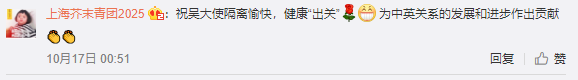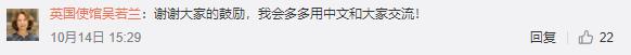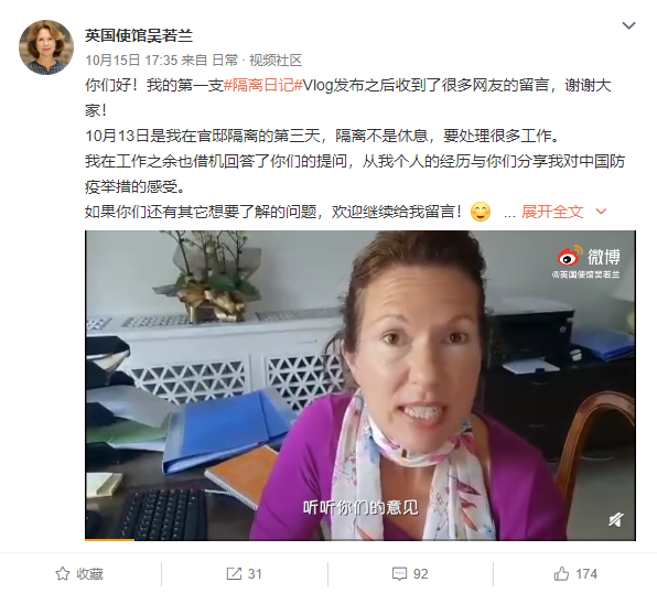前不久,英国新任驻华大使吴若兰(Caroline Wilson)抵达北京开始任期,12日,她在自己的个人微博上发布消息说,回到了官邸开始为期14天的隔离。隔离期间,她用中文录制了隔离日记Vlog,大赞中国的防疫措施和卫生人员专业。