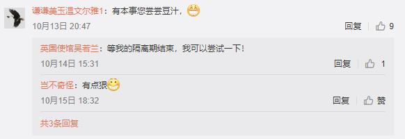 她也在微博留言栏跟网友互动,表示自己会努力学好普通话,准备等隔离结束尝试北京小吃“豆汁”。