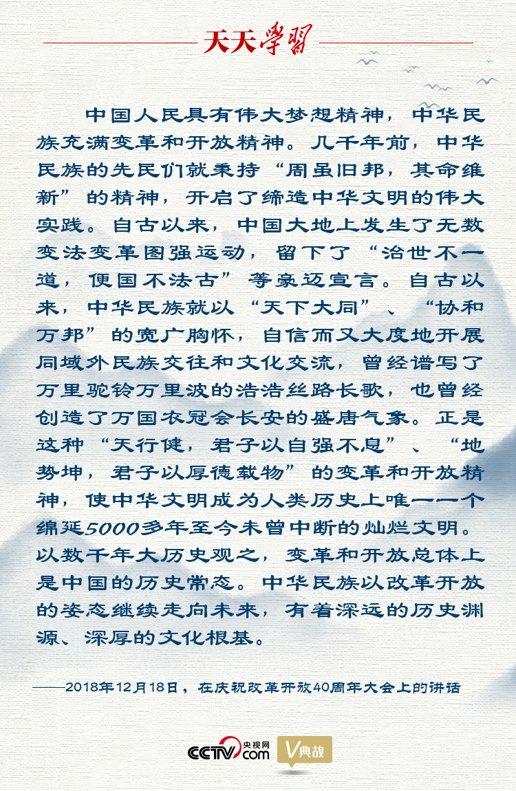 改革创新是时代精神,是民族进步之魂。2018年12月18日,在庆祝改革开放40周年上大会的讲话中,习近平总书记回顾了5000多年中华文明史,他引用“治世不一道,便国不必法古”这句闪耀着历史进化论思想光芒的古语,说明在新时代,中国人民将继续自强不息、自我革新,中国变革创新的脚步永不停歇。
