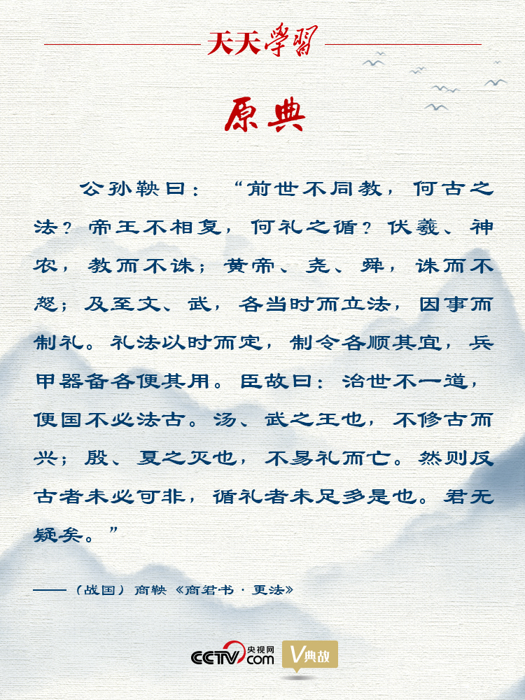 在当时,秦国在战国七雄中实力最弱,不仅受其他六国轻视,而且被拒之于盟会之外。秦国内部,由于贵族政治和君主的冲突,大权旁落在乱臣之手;在外部,邻国魏国由于最早变法,国力日强,经常侵夺秦国领土。秦孝公继位后决心图强改革,便向社会公开招贤。卫国人商鞅(原名公孙鞅)所献的改革方略得到秦孝公的称许,却遭到旧贵族的强烈反对。他们提出圣人不改变民风民俗就能施行教化,智者不改变旧法就能治理国家,坚持认为“法古无过,循礼无邪”。商鞅针锋相对地指出,夏、商、周三代的礼制不同,但都成就了王业;春秋五霸的法度也各不相同,但都成就了霸业,必须“不法其故”“不循其礼”,这样才能够实现强国富民的目标。他提出了“治世不一道,便国不必法古”的主张,意思是治理国家不一定用一种方略,只要对国家有利就不一定非要效法古代。这坚定了秦孝公改革的决心,由此开始了彪炳史册的商鞅变法,秦国逐渐走向富强。