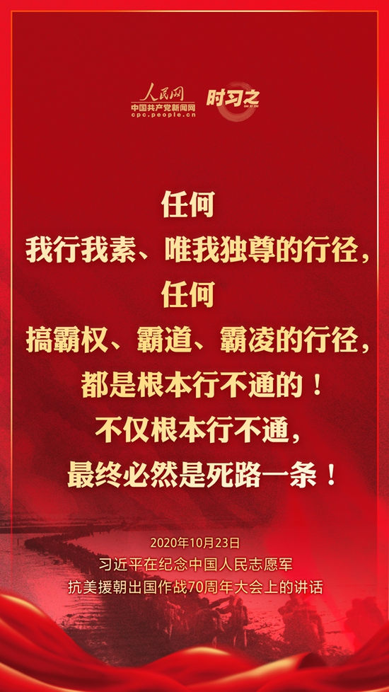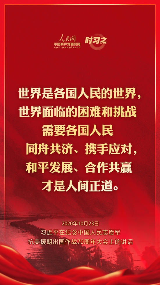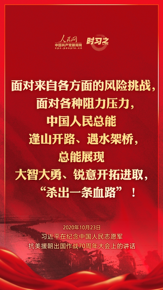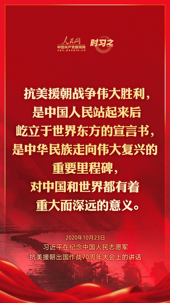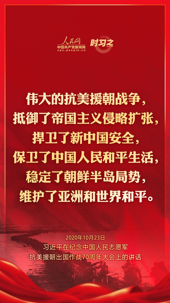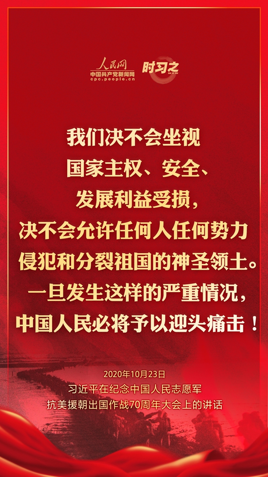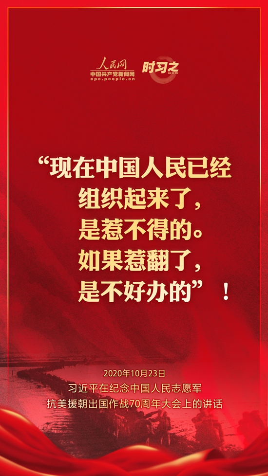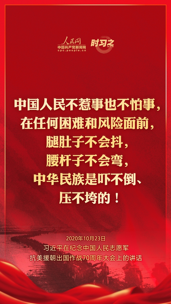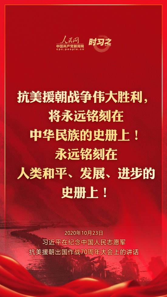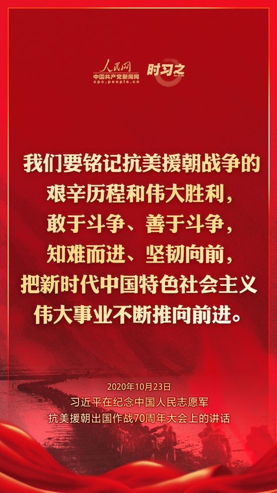 10月23日上午10时,纪念中国人民志愿军抗美援朝出国作战70周年大会在北京人民大会堂隆重举行。中共中央总书记、国家主席、中央军委主席习近平出席大会并发表重要讲话。在讲话中,习近平总书记全面回顾总结了抗美援朝战争的伟大胜利和巨大贡献,深刻阐述了抗美援朝精神的历史意义和时代价值,精辟揭示了抗美援朝战争的历史启示,郑重宣示了捍卫国家领土主权和统一、维护地区和世界和平稳定、推动构建人类命运共同体的坚定立场和决心,强调要铭记伟大胜利,敢于斗争、善于斗争,把中国特色社会主义伟大事业不断推向前进。人民网·中国共产党新闻网“时习之”栏目制作了12张海报,带您一起回顾总书记铿锵有力的话语。