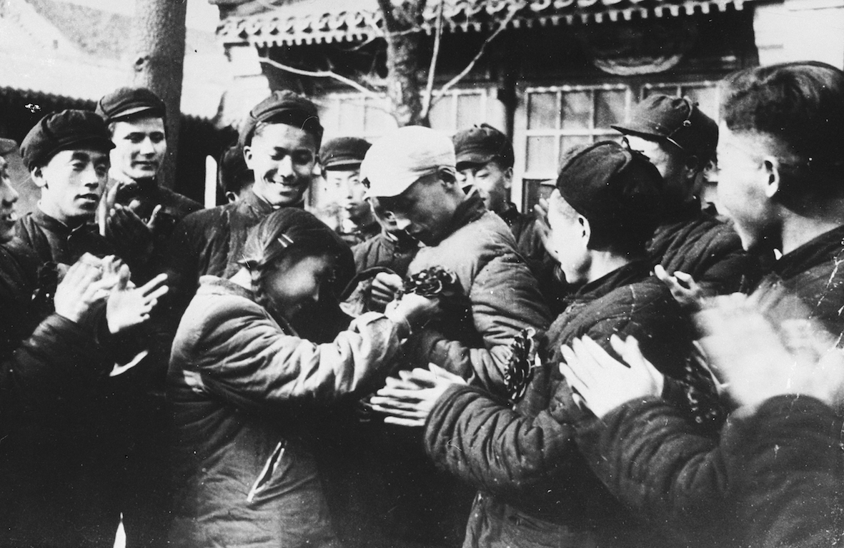 △1950年12月,北京,报名参加抗美援朝的学子被同学们戴上光荣花。