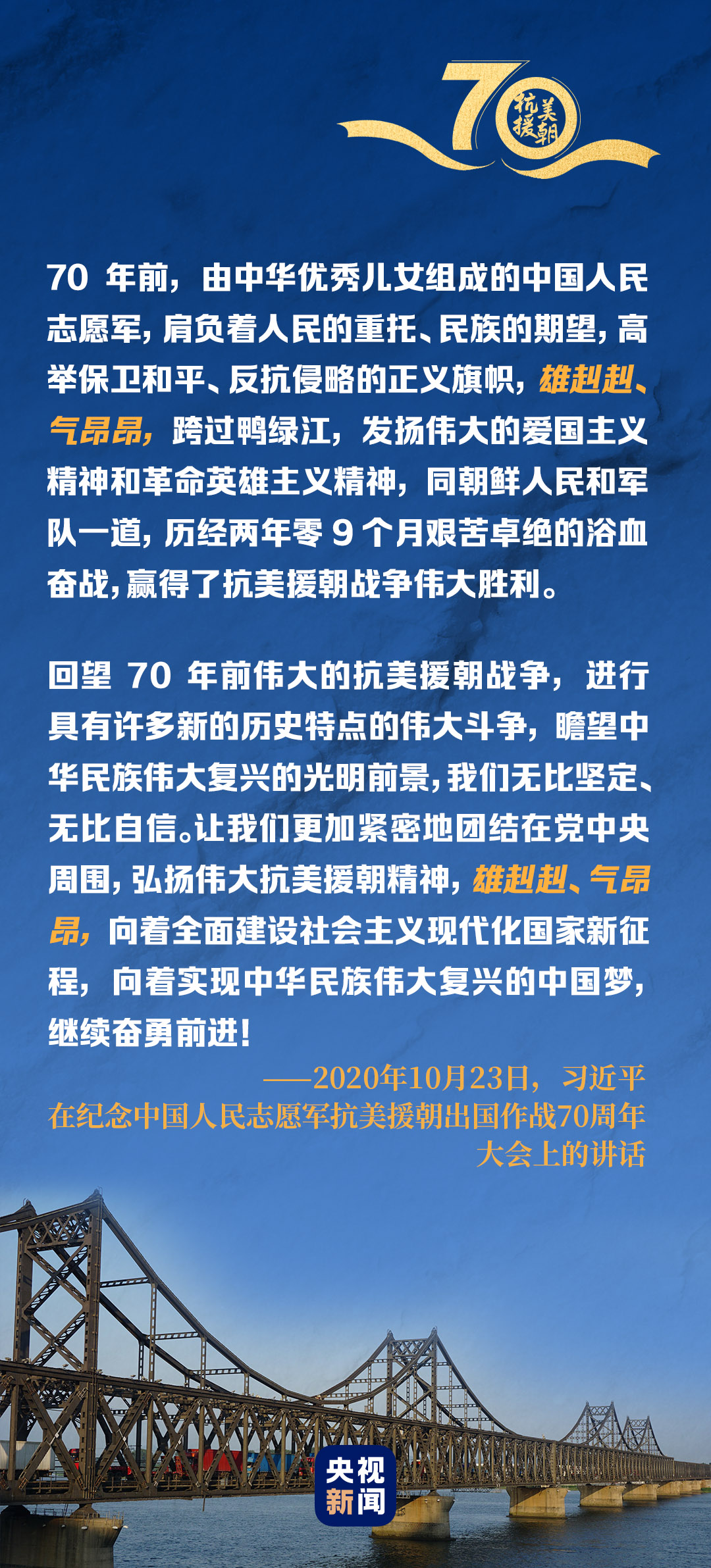 10月23日,习近平总书记在纪念中国人民志愿军抗美援朝出国作战70周年大会上的重要讲话中,两次提到“雄赳赳、气昂昂”。