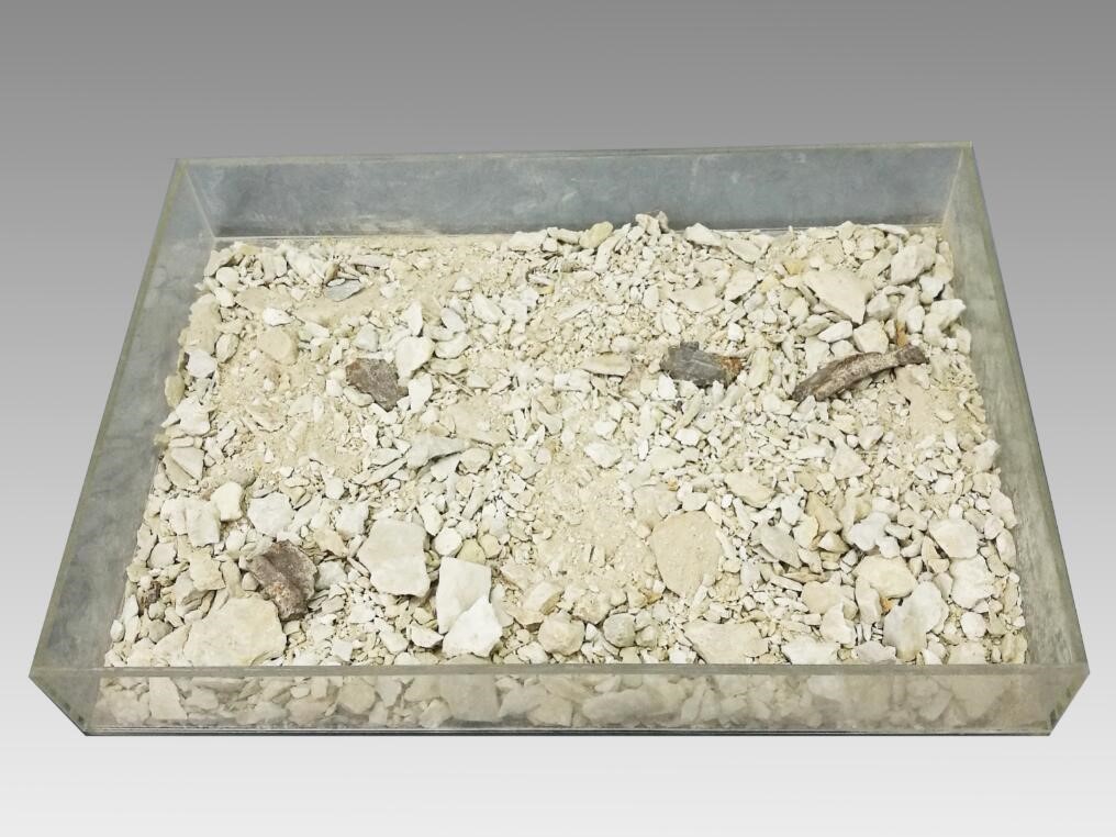 这是白色花岗岩被炮弹炸成碎块和粉末,大的碎石块有1厘米左右,中型碎块有0.5厘米左右,大部分已成小米状粉末,内有5块炮弹残片。这是见证残酷战争的岩石粉沫与弹片,1958年,志愿军归国时将它带回捐赠给抗美援朝纪念馆。