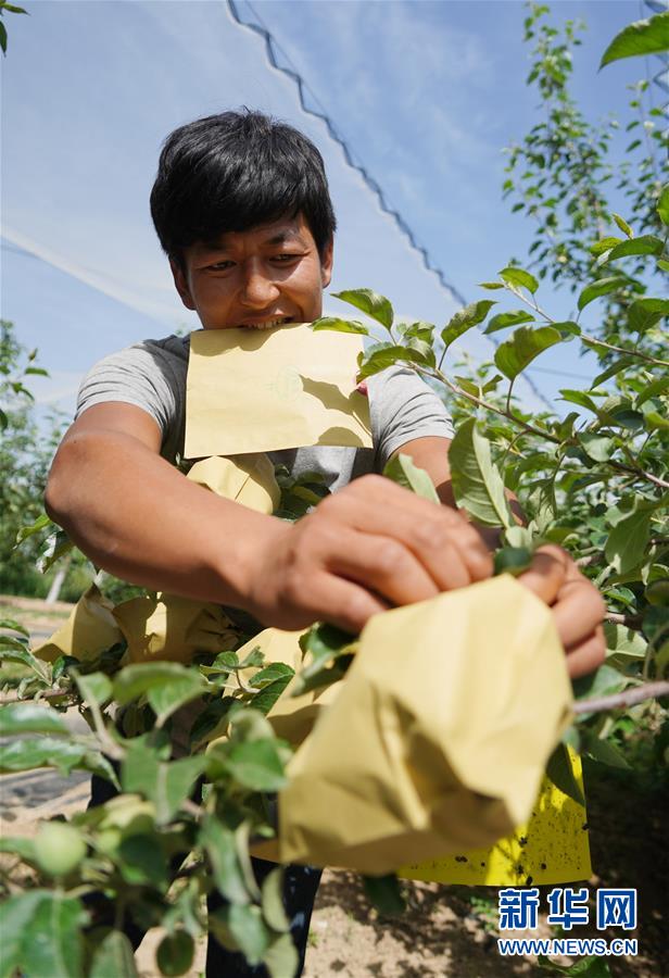 陕西省延安市梁家河村村民在给苹果套袋(2018年5月24日摄)。新华社记者 邵瑞 摄