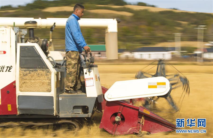 在吉林省延边州和龙市光东村稻田里,农民驾驶收割机收获成熟的水稻(2019年10月10日摄)。新华社记者 许畅 摄