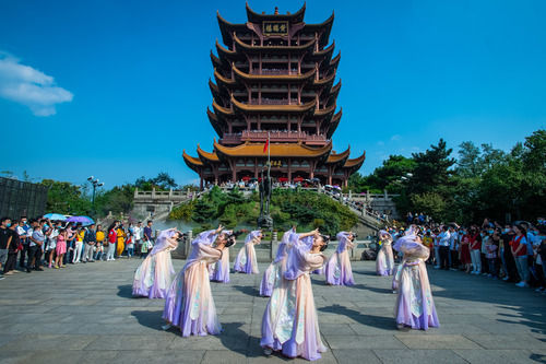 游客在武汉黄鹤楼景区观看演出(10月1日摄)。新华社记者 肖艺九 摄