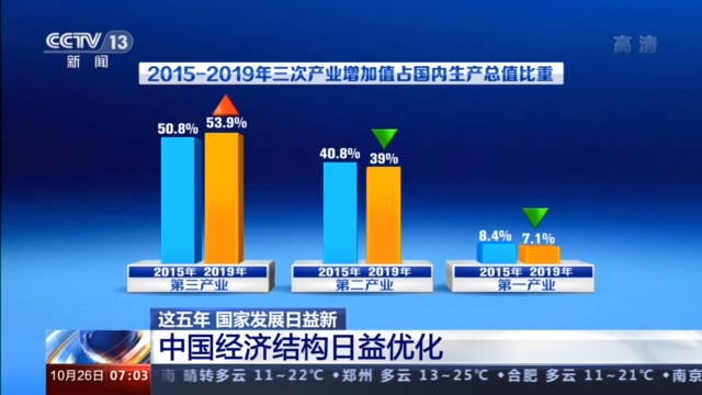 从“十二五”末的2015年到2019年,第三产业增加值占国内生产总值的比重从50.8%增加到了53.9%,与此同时,第二产业增加值的比重下降到39%,第一产业增加值的比重下降到7.1%。