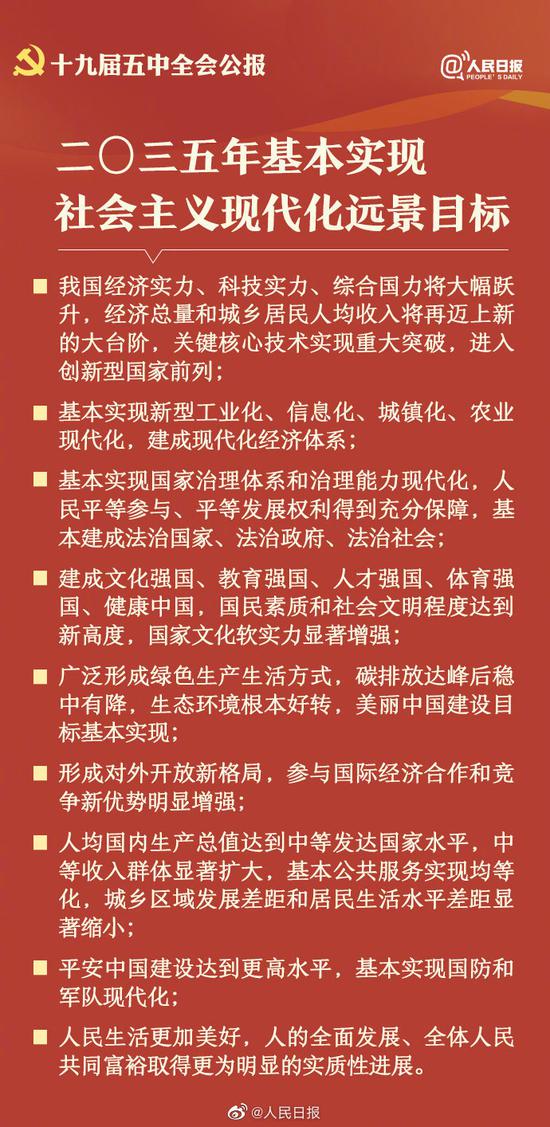 10月29日,中国共产党第十九届中央委员会第五次全体会议公报发布。全会高度评价决胜全面建成小康社会取得的决定性成就,提出了到二〇三五年基本实现社会主义现代化远景目标以及“十四五”时期经济社会发展主要目标。中国将如何实现这一宏伟蓝图,14个关键词速读五中全会公报。