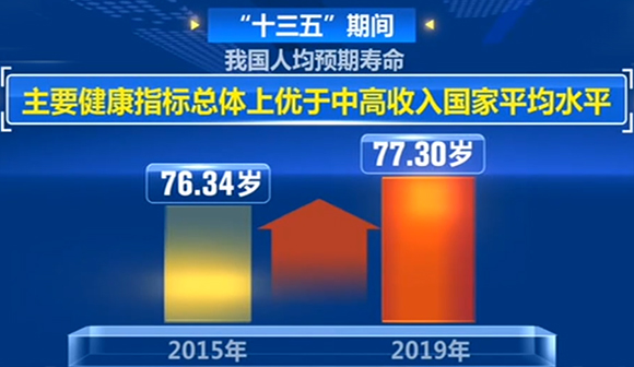 央视网消息:“十三五”期间,我国人均预期寿命从2015年的76.34岁提高到2019年的77.3岁,主要健康指标总体上优于中高收入国家平均水平。