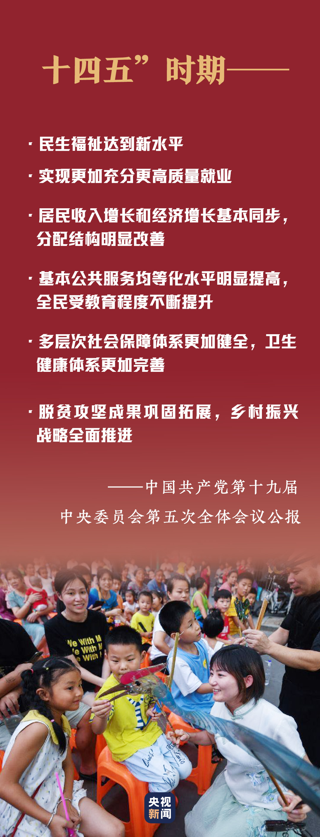 十九届五中全会提出,不断增强人民群众获得感、幸福感、安全感,促进人的全面发展和社会全面进步。“以满足人民日益增长的美好生活需要为根本目的”“坚持以人民为中心,坚持新发展理念,坚持深化改革开放,坚持系统观念”“改善人民生活品质,提高社会建设水平”......