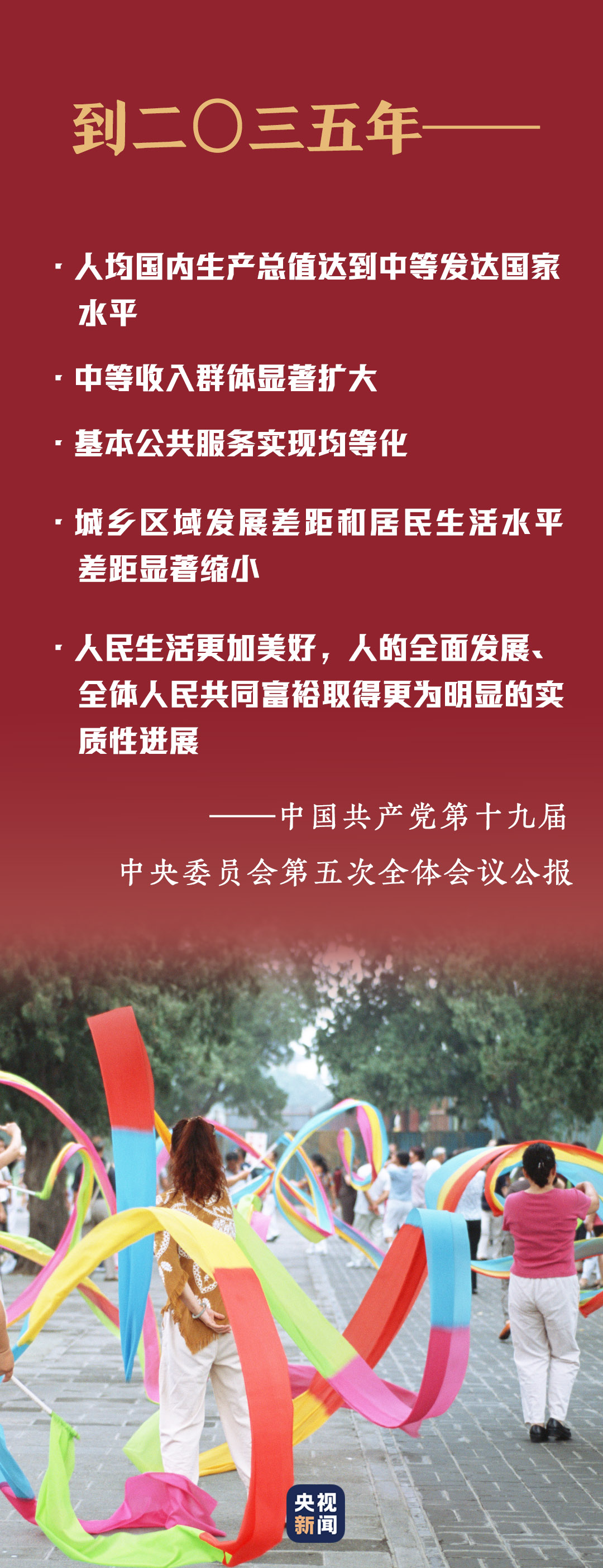 十九届五中全会提出到二〇三五年基本实现社会主义现代化远景目标。到那时,人民生活更加美好,人的全面发展、全体人民共同富裕取得更为明显的实质性进展。