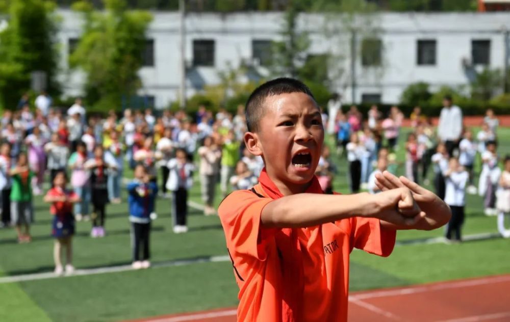 9月8日,在陕西平利老县镇中心小学的操场上,学生沈首洋(前)在大课间武术操上领操。新华社记者 李一博 摄