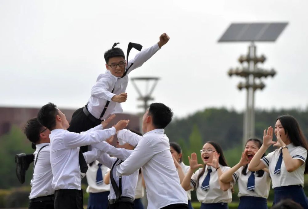 2020年6月10日,在南昌大学校园内,学子们一起欢呼,拍毕业照留念。新华社记者 彭昭之 摄