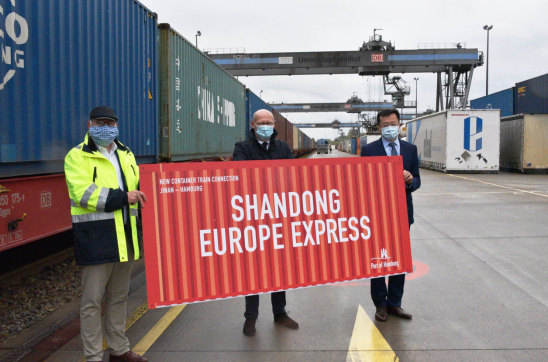 △马特恩(左)2020年4月30日在汉堡港货运场站与中国驻汉堡总领事杜晓晖、汉堡市经济部长韦斯特哈格曼共同迎接首趟济南至德国汉堡中欧班列的抵达(来源:汉堡港营销协会)
