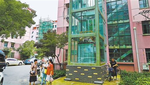 在上海市长宁区北新泾街道新泾六村,居民在加装了电梯的12号楼旁聊天。 新华社记者 方 喆摄