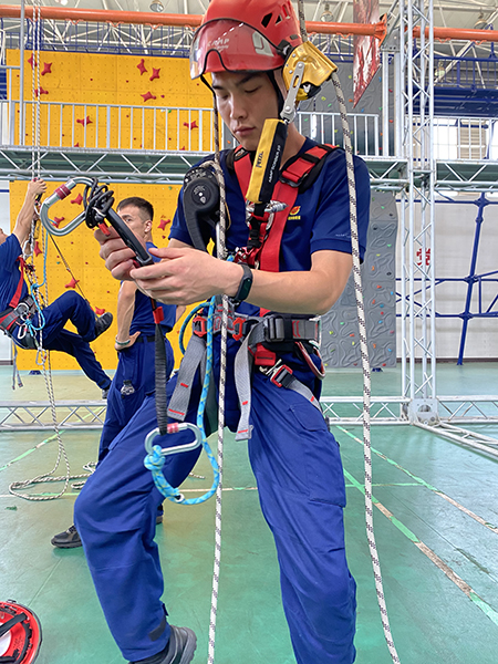 8月14日王鹏(左一)参加绳索救援训练时的场景