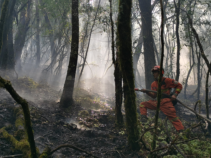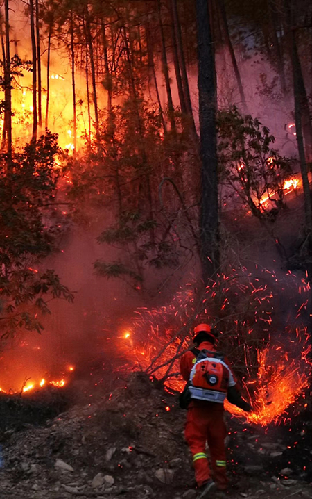 2019年3月,在凉山木里火场,王鹏和战友连续奋战10余天,成功将大火扑灭。王鹏身背灭火机扑打明火。