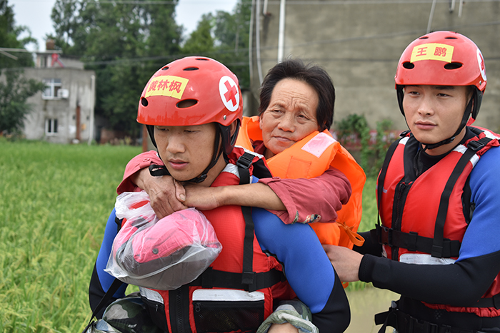 8月17日,四川省成都市金堂县发生洪涝灾害,部分村庄房屋被洪水淹没。王鹏(右一)和战友乘坐橡皮艇挨家挨户搜寻转移被困群众。王鹏和战友转移行动不便的高龄老人。