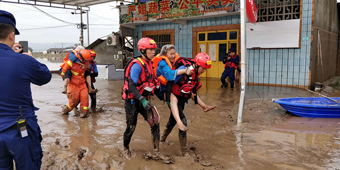 8月19日,王鹏(右一)在四川省乐山市金粟镇参加抢险救援,连续在水中浸泡了10余个小时,背着群众在泥泞中前行,成功将孤岛中的群众转移至安全区域。
