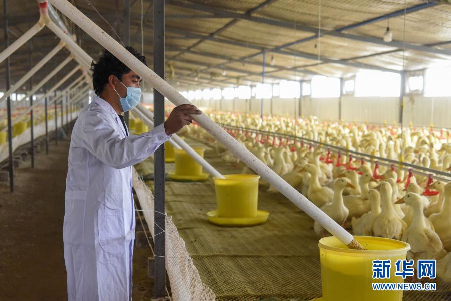 在洛浦县山普鲁镇博斯坦库勒村的奋斗家禽养殖农民专业合作社,“嘎嘎”的鸭叫声此起彼伏。25岁的“鸭保姆”阿布来提·热杰普忙着给鸭子补充饲料。作为建档立卡贫困户,此前务农的他去年9月来到合作社,在专业人员的培训下很快上手,如今月收入近3000元。