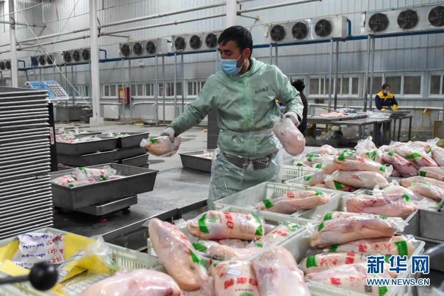在新疆和田地区洛浦县北京工业园区内的利田香农食品有限公司,工人将包装好的鸭产品称重(11月7日摄)。新华社记者 丁磊 摄