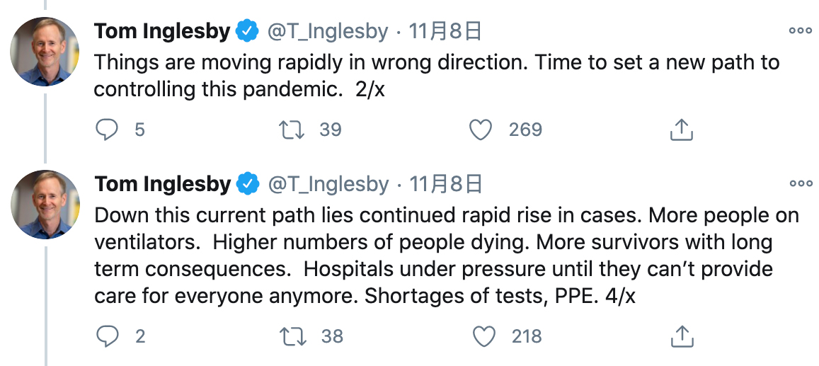 约翰斯·霍普金斯大学健康卫生安全中心主任汤姆·英格斯比在社交媒体上发文称:“照目前的趋势来看,美国确诊病例数将持续激增,死亡病例数也将增加。医院将承受越来越大的压力,直到它们超负荷运转,无法再为病人提供治疗。”