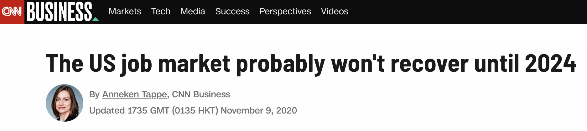 穆迪公司预测,在2024年之前,美国或将无法完全恢复因疫情而失去的2200万个工作岗位。美国有线电视新闻网(CNN)称,要想让美国经济复苏,需要付出长时间的努力。