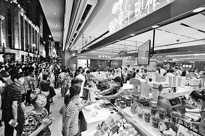 市民、游客在上海南京路步行街东拓段新开通街道边的商店购物。新华社发