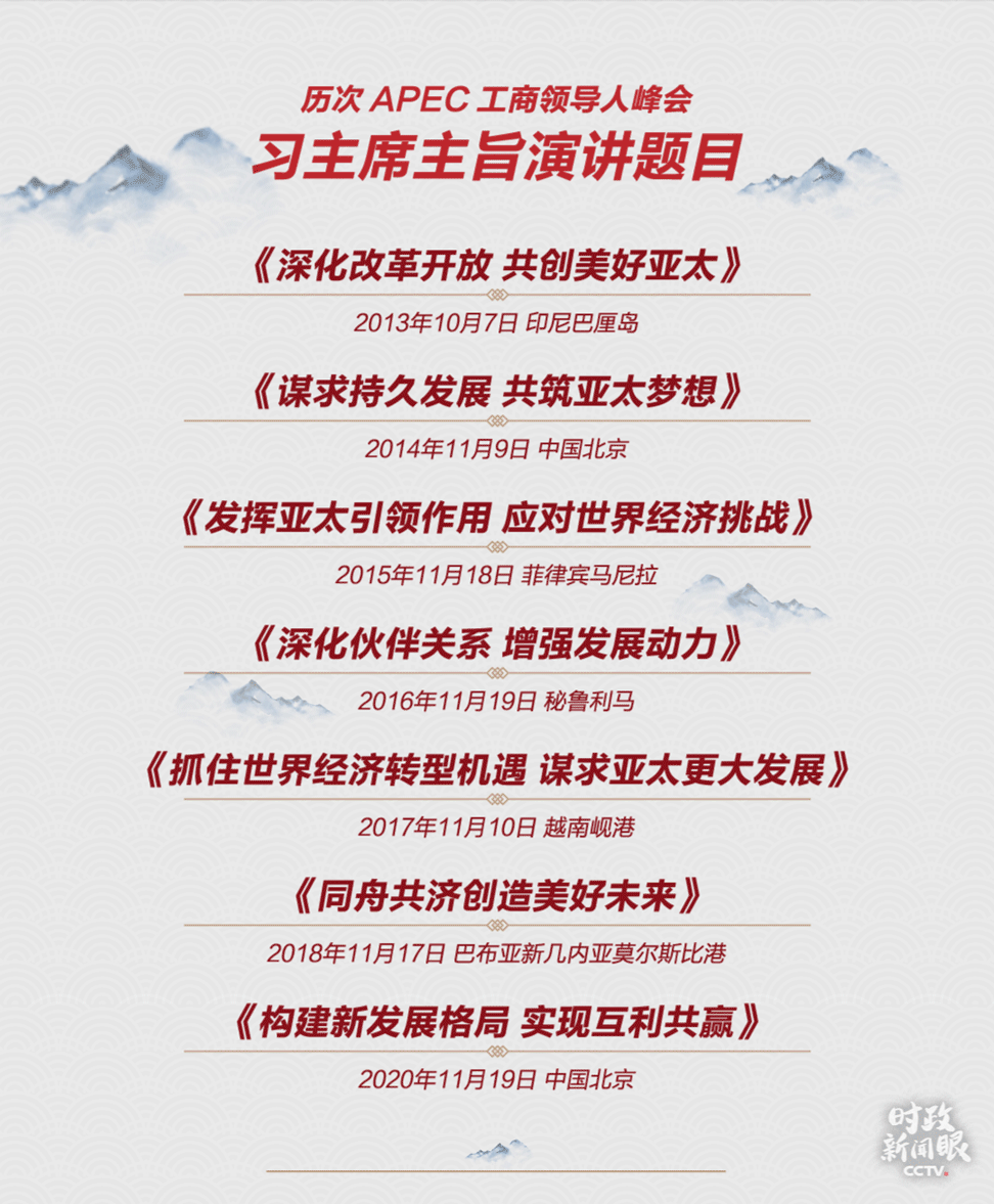 APEC工商领导人峰会有一个传统,就是邀请包括中国在内的大国领导人发表演讲。2013年以来,从印尼巴厘岛到巴布亚新几内亚莫尔斯比港,习主席曾连续六年出席APEC工商领导人峰会并发表主旨演讲。今年是他第七次在这一场合发表演讲。