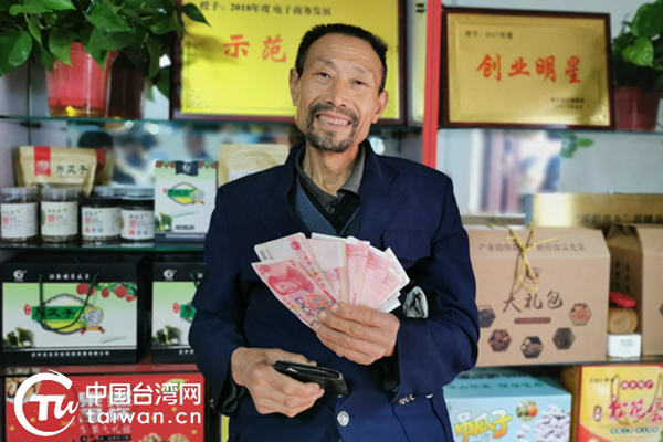 屈扶庭拿到新卖的吊瓜子钱,感到很开心。(中国台湾网 李宁 摄)