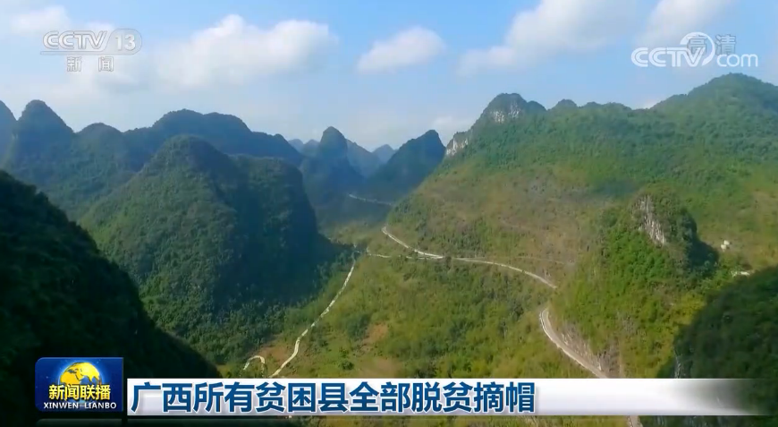 央视网消息(新闻联播):今天(11月20日),广西壮族自治区宣布最后8个贫困县摘帽,区内所有贫困县全部脱贫摘帽。