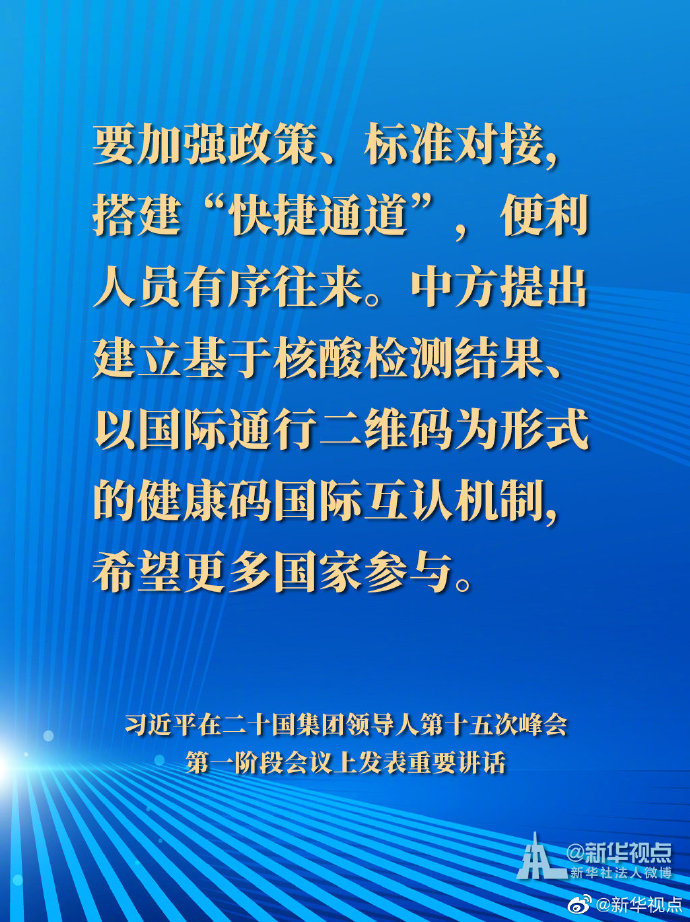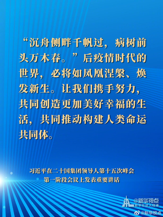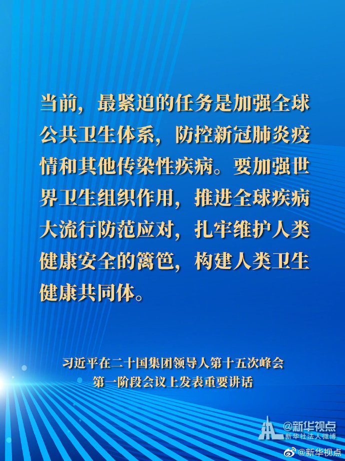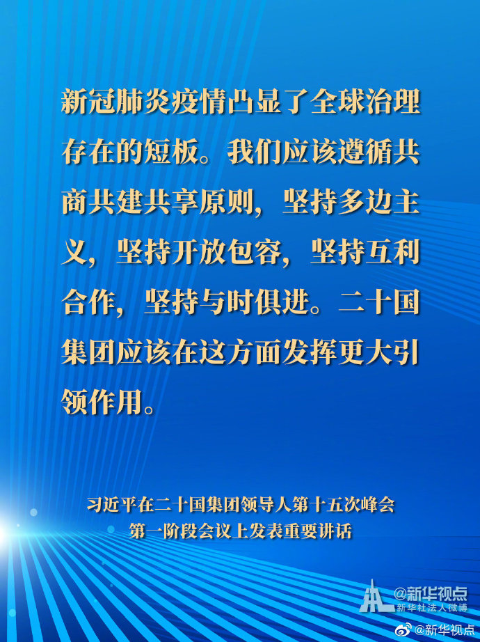 国家主席习近平21日晚在北京以视频方式出席二十国集团领导人第十五次峰会第一阶段会议并发表重要讲话。以下是讲话要点。