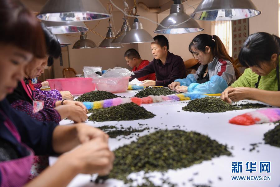 10月27日,在福建省安溪县感德镇槐川村的庆芸茶叶专业合作社,合作社理事长陈庆云(右三)和工人在分拣铁观音茶叶。新华社记者 宋为伟 摄