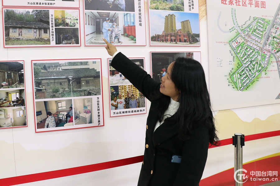 旺家社区党总支部副书记何英向记者介绍万山区易地扶贫搬迁后,当地村民居住条件的变化。(中国台湾网 尹赛楠 摄)