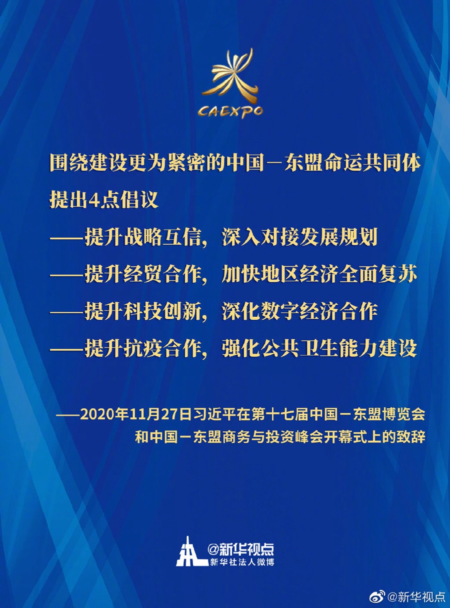 第十七届中国-东盟博览会和中国-东盟商务与投资峰会开幕式11月27日在广西南宁举行。国家主席习近平在北京以视频方式发表致辞。一起来划重点