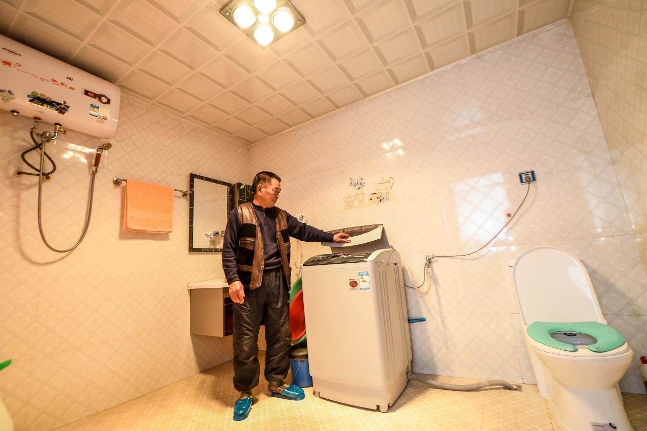 2017年1月24日,吉林延边光东村村民全得成在自家卫生间内使用洗衣机。