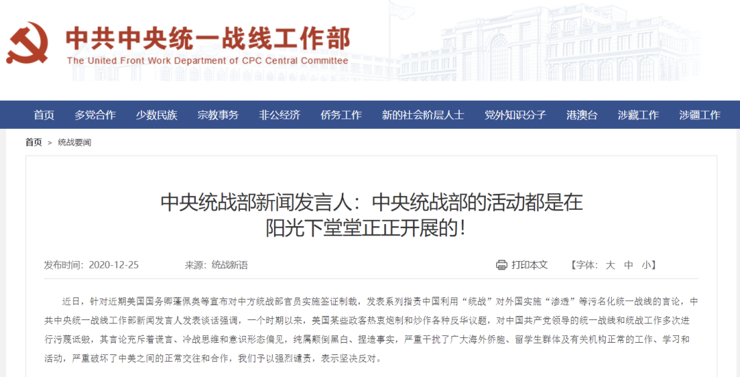 近日,针对近期美国国务卿蓬佩奥等宣布对中方统战部官员实施签证制裁,发表系列指责中国利用“统战”对外国实施“渗透”等污名化统一战线的言论,中共中央统一战线工作部新闻发言人发表谈话强调,一个时期以来,美国某些政客热衷炮制和炒作各种反华议题,对中国共产党领导的统一战线和统战工作多次进行污蔑诋毁,其言论充斥着谎言、冷战思维和意识形态偏见,纯属颠倒黑白、捏造事实,严重干扰了广大海外侨胞、留学生群体及有关机构正常的工作、学习和活动,严重破坏了中美之间的正常交往和合作,我们予以强烈谴责,表示坚决反对。