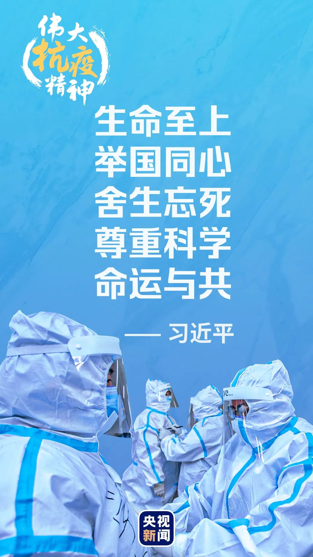 “在这场同严重疫情的殊死较量中,中国人民和中华民族以敢于斗争、敢于胜利的大无畏气概,铸就了生命至上、举国同心、舍生忘死、尊重科学、命运与共的伟大抗疫精神。”