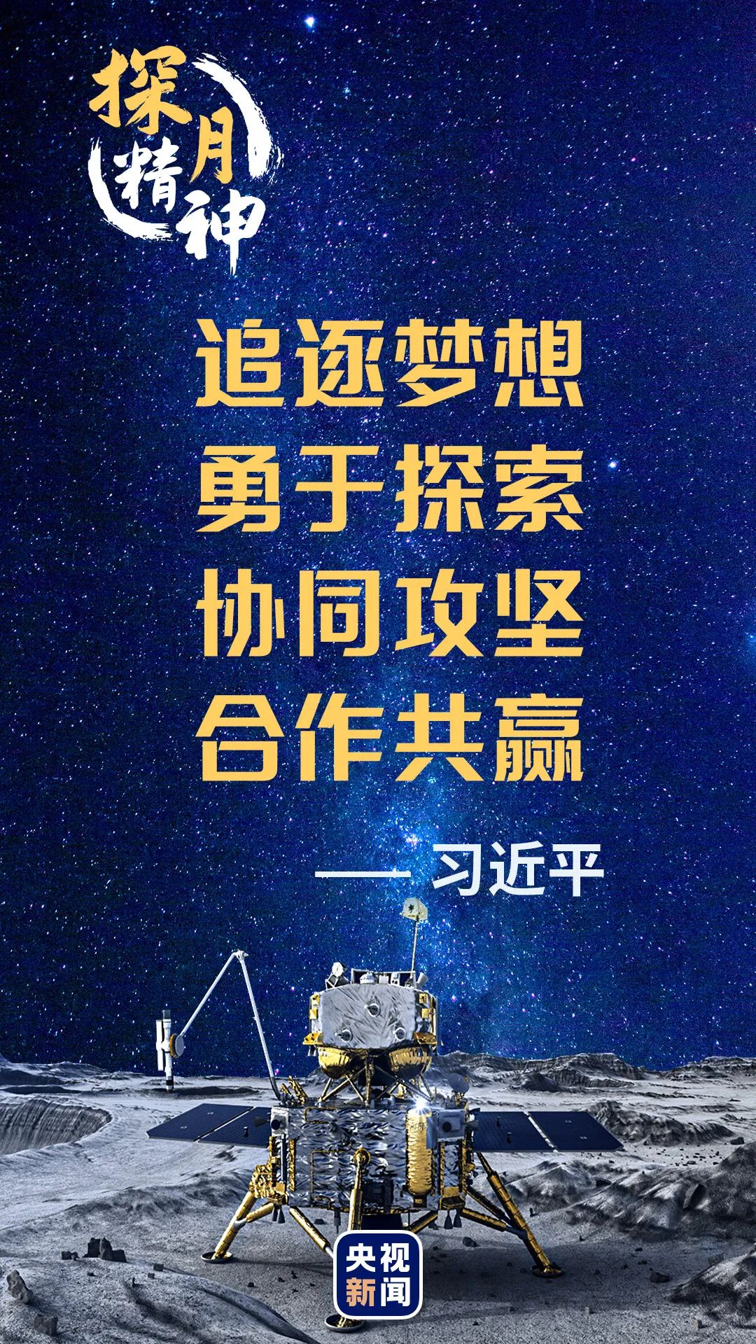 追逐梦想、勇于探索、协同攻坚、合作共赢的探月精神,是中国航天人在建设航天强国征途上立起的一座精神丰碑,激励着中国航天人继续勇攀高峰,为建设航天强国、实现中华民族伟大复兴的中国梦,为人类和平利用太空、推动构建人类命运共同体作出更大的贡献。