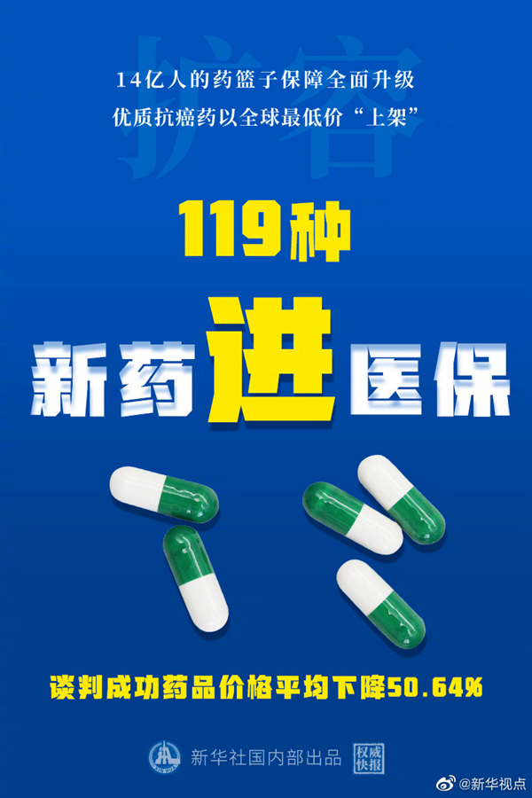 2020年国家医保目录调整结果28日出炉。119种新药被纳入医保,谈判成功的药品价格平均下降50.64%。多个新上市抗癌药以全球最低价“上架”。(记者:屈婷 海报设计:张晨光)