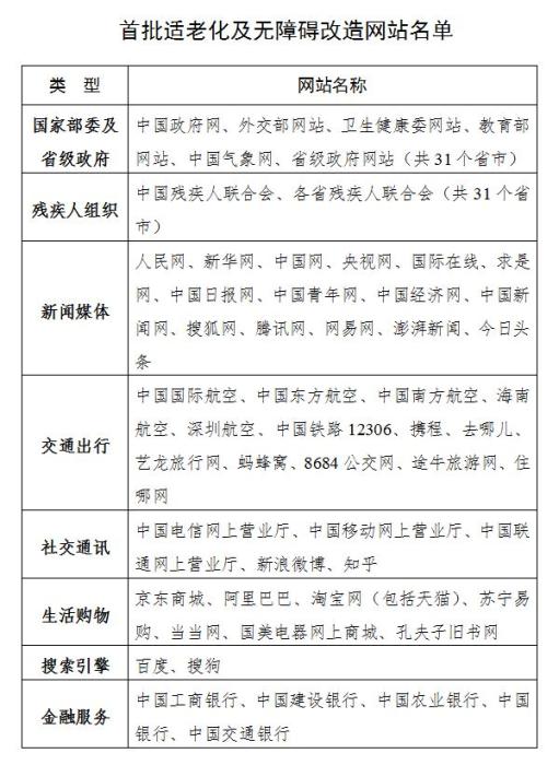 开展互联网主要行业网站适老化及无障碍改造。紧密结合老年人、残疾人等群体的实际需求,对《工业和信息化部 中国残疾人联合会关于推进信息无障碍的指导意见》(工信部联信管〔2020〕146号)中提出的与老年人、残疾人等群体工作、生活密切相关的公共服务类网站开展适老化及无障碍改造。首批优先推动国家相关部委及省级人民政府、残疾人组织、新闻媒体、交通出行、金融服务、社交通讯、生活购物、搜索引擎等8大类、共115家网站进行改造(网站名单见附件1)。中国互联网协会协助基础电信企业及网站接入服务商加快互联网无障碍服务体系建设,持续推动互联网信息无障碍环境建设健康发展。