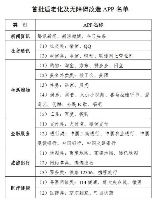 开展老年人、残疾人常用移动互联网应用(APP)的适老化及无障碍改造。立足老年人、残疾人的实际生活体验,丰富满足其需求的移动互联网应用(APP)种类和功能,对《工业和信息化部 中国残疾人联合会关于推进信息无障碍的指导意见》(工信部联信管〔2020〕146号)中列出的移动互联网应用十大领域、注册用户数超过5000万人、同类产品中市场份额排名前5名的APP进行适老化及无障碍改造。首批优先推动新闻资讯、社交通讯、生活购物、金融服务、旅游出行、医疗健康等6大类、共43个APP进行适老化及无障碍改造(APP名单见附件2)。中国信息通信研究院协助各互联网企业,在开发设计移动互联网应用(APP)的过程中落实信息无障碍有关标准的要求,并将无障碍优化纳入产品及服务的日常维护流程。
