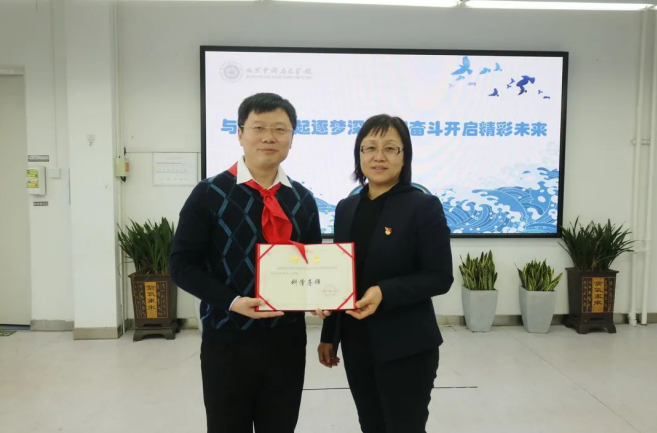中科启元学校党支部书记王群英向中科院声学所研究员、11000米“全海深载人潜水器”副总设计师、“载人深潜英雄”杨波颁发科学导师聘书。 主办方供图