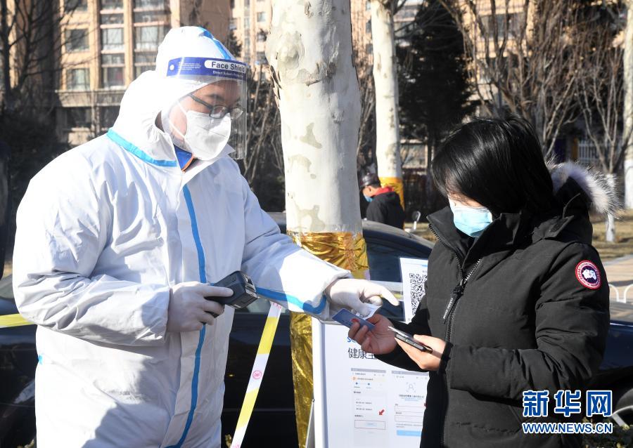 2021年1月3日,在北京市顺义区双丰街道香悦西区采样点,工作人员(左)通过取码终端将生成的纸质核酸检测预约码交给被检测人员。