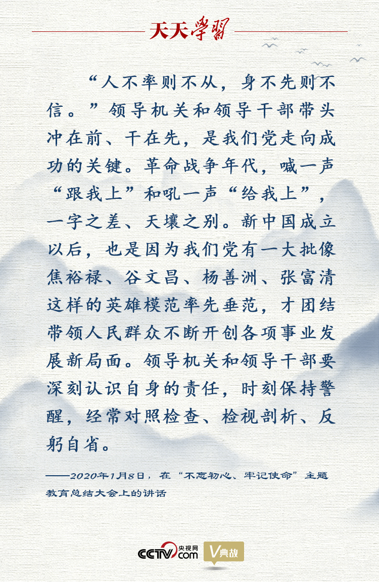 总结大会上,总书记在讲到“不忘初心、牢记使命,必须坚持领导机关和领导干部带头”时,引用了“人不率则不从,身不先则不信”这句古语。他指出,领导机关是国家治理体系中的重要机关,领导干部是党和国家事业发展的“关键少数”,对全党全社会都具有风向标作用。在上面要求人、在后面推动人,都不如在前面带动人管用。领导机关和领导干部带头冲在前、干在先,是我们党走向成功的关键。
