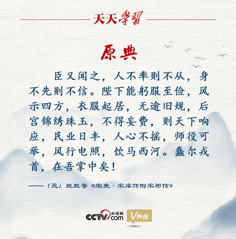 作为北宋的一代名臣,宋祁以天下为己任。宝元二年(1039年),面对西北边境战事吃紧、国家财政日益困窘的情况,宋祁向宋仁宗呈奏《上三冗三费疏》,建议“去三冗”(冗官、冗兵、冗僧)、“节三费”(道场斋醮、多建寺观、靡费公用),直言朝廷应该精兵简政,节约开支,并劝谏宋仁宗从自身及后宫嫔妃做起,带头节俭,布告四方,这样天下就会群起响应。由此提出了“人不率则不从,身不先则不信”的谏言,意思是在上位的人如果自己不作表率,下面的人就不会跟从;如果自己不身先力行,下面的人就不会信服。