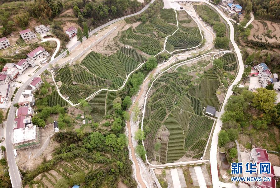 这是2020年4月17日拍摄的金寨县花石乡大湾村的茶产业扶贫基地(无人机照片)。新华社记者刘军喜摄
